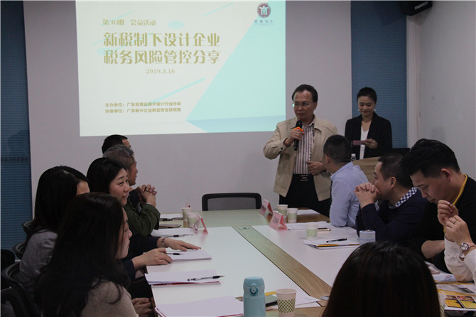 3月16日下午,由广东省商业美术设计行业协会主办,广东新兴企业财富安全研究院协办的“新税制下的设计企业税务风险管控分享”会员活动在协会会议室成功举办,原财政部驻广东省财政监察专员杨宪华、执行会长高晓峰、协会常务副会长陈维新、广东新兴企业财富安全研究院院长熊剑斐、广东能迪资本管理有限公司总经理吴向能、广州六环广告有限公司总经理吴振智、广州市联合利源建材有限公司总经理邹兴国、广州巴国广告有限公司总经理姚建国等20余人出席活动。
