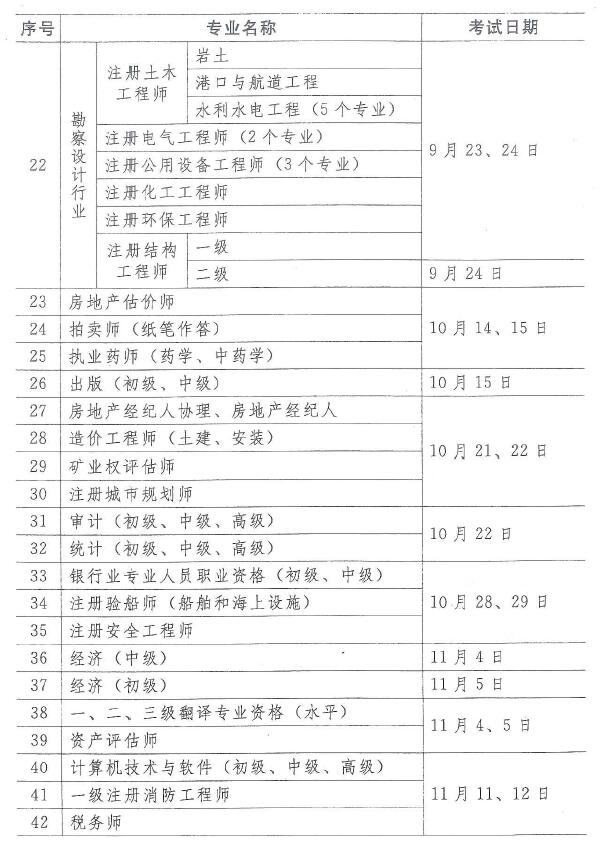 14 | 一级建造师(10个专业) | 9月16、17日 | ||