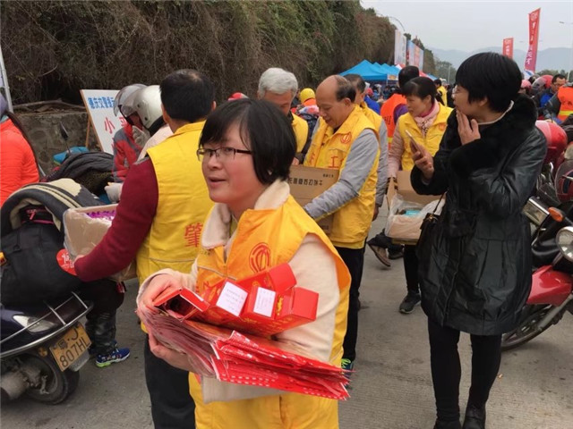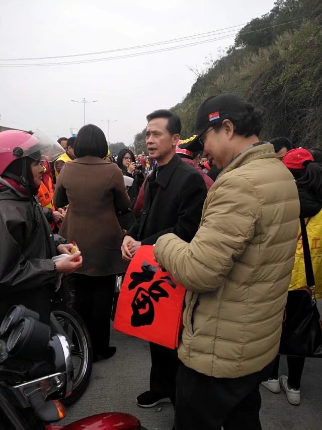 7日活动现场,在肇庆德庆,临近春节,由粤返桂、川、渝过年的农民工携妻带子驾着摩托车,冒着严寒,长途跋涉、约有1.5万辆,3-4万人经过此地,令人惊叹,揾食不易啊~~~在广东省人大常委会副主任、广东省总工会主席黄业斌的带领下,南方书画院的书画家和当地的志愿者纷纷把热水、食品、春联、福字送给路经的农民工,向他们送上新春的祝福,之后继续进行现场挥春送福活动!农民工们很受感动、非常开心!