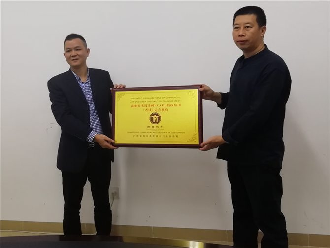高晓峰会长为珠海艺术职业学院颁发商业美术设计师(CAD)授权培训(考试)定点机构牌匾。