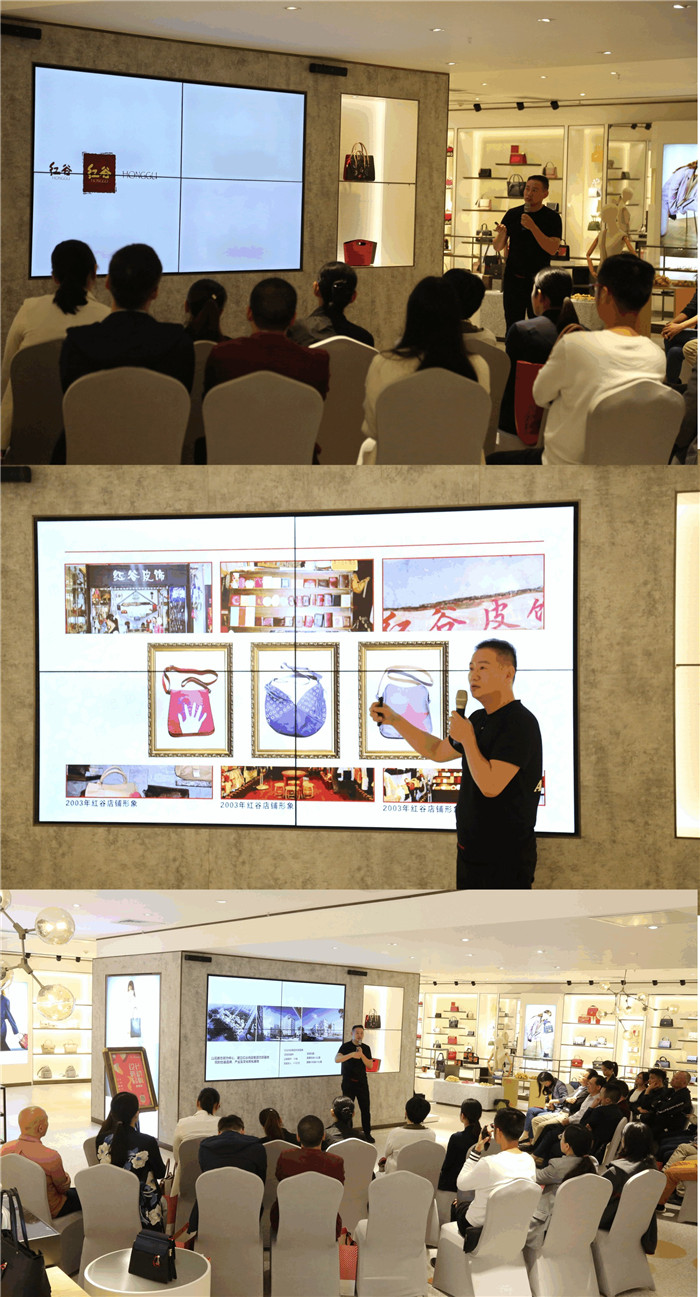 交流会上,企业定制事业部郑杨总经理为大家做主题分享,他从红谷LOGO标志的演变、发展历程、品牌介绍、全新企划转变、强强联手(战略合作企业)等五方面,讲解如何把一个本土品牌转变成时尚品牌的。并表示红谷在品牌塑造道路上积极探索传统文化,努力传承中国箱包文化,其每一系列皮包在保留中国传统文化的同时又兼具时尚特色,把当季国际流行趋势融入主题元素,进行研发设计,使得传统美学在皮包这一时尚饰物上得以最大的发挥,在传递中国文化的同时满足消费者的时尚需求,并最终实现二者和谐统一。